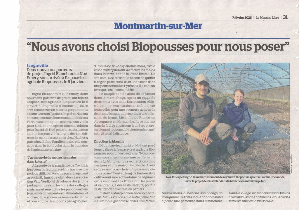 Démarrage du test d’activité agricole d’Ingrid Blanchard et Noé Emery en janvier 2026 en production maraîchère bio diversifiée :