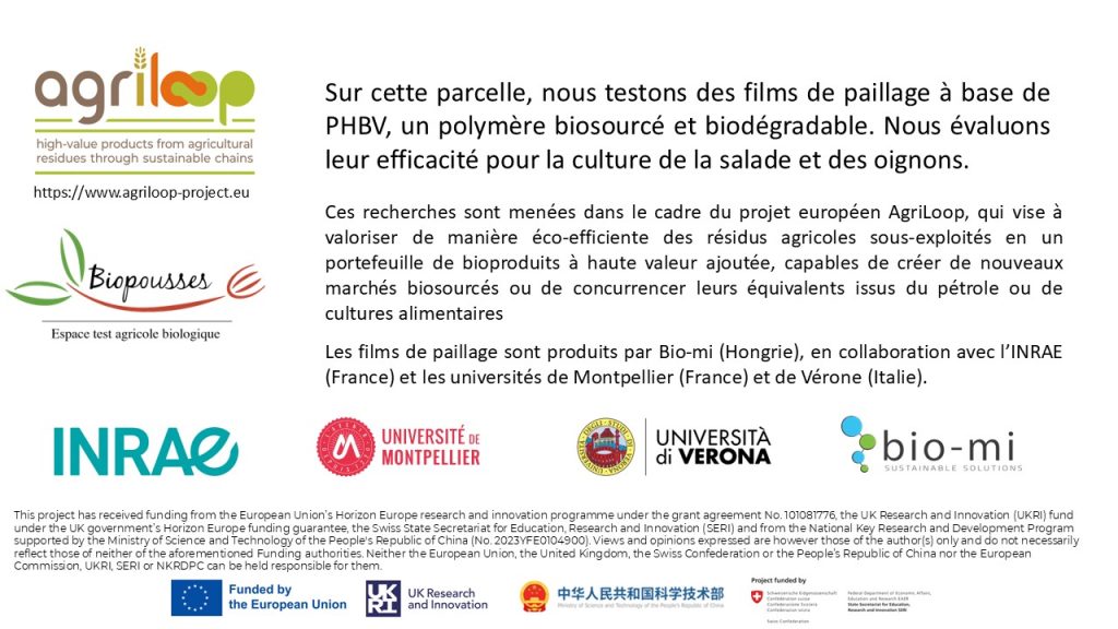 Biopousses participe à ce projet en mettant à disposition une parcelle pour tester des films de paillage à base de PHBV, un polymère biosourcé et biodégradable, et suivant l’expérimentation et la mise en place du protocole sur la culture des salades et des oignons.